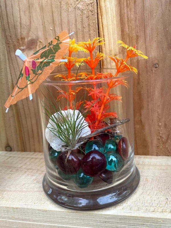 This Tillandsia Air Plant order comes with a crystal Geode rock in a small glass Tropical display! This air plant display is made with glass marbles, artificial orange plant and umbrella, crystal clustered Geode rock and mini decor message bottle. This creation actually comes with 2 green air plants joined together standing about 3 inches tall. Total jar stands inches 4 tall and 3 1/2 inches wide. This set up allows you to take the air plant out and water once a week, allowing it to fully air-dry upside down or spraying/misting as needed. These items are separated during shipping.