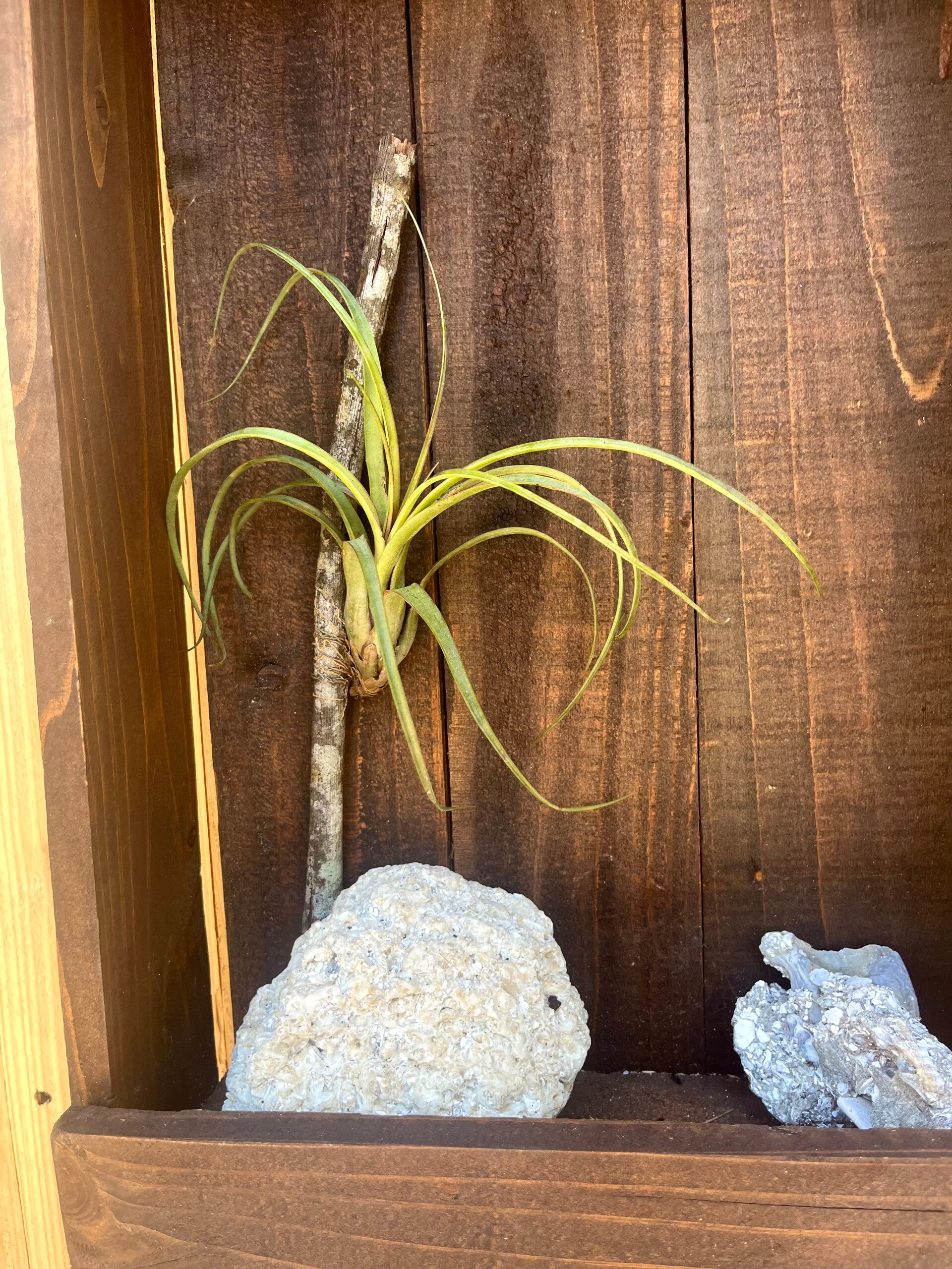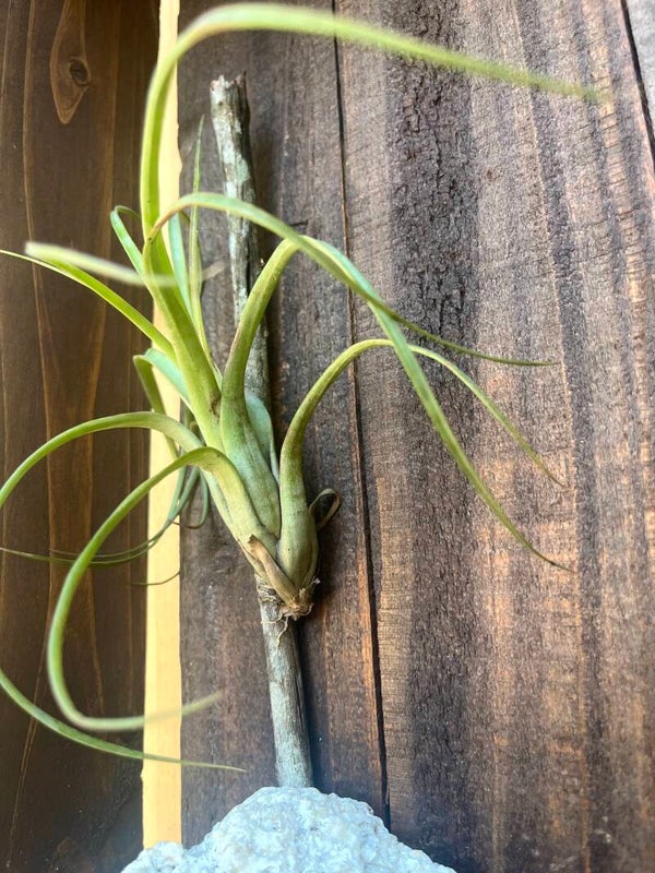 This Tillandsia Air Plant is grown standing around 7 inches tall and arms reaching to about 10 inches. I believe this to be the Tillandsia Balbisana, theres so many that look so close to eachother until their fully grown. This is a beauty already and you know your going to have something most dont have in their collection. This is a very easy plant to care for. Bright indirect light (great for indoors) a good watering/spraying once a week, allowing it to fully dry inbetween waterings. I love that this plant is already attached to her forever stick/home, which makes finding a place to prop her a lot easier! This plant is so amazing and makes a great living decor piece in any home! This is also the perfect size plant for an apartment or small living space, only growing up to 2 feet tall at most. She'll produce pups, as well as giving you a purple flower show and then seeding. Amazing!