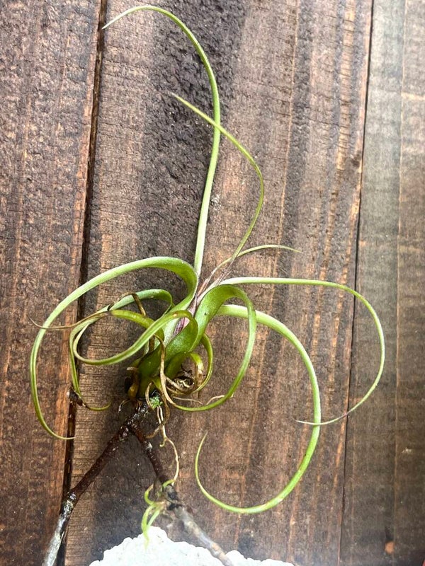 This Tillandsia order is already attached to its branch and just needs a home! Currently this plant is around 5 or 6 inches tall and a few inches wide. This plant is a few years old and already thriving! This is such an easy plant to propagate with the pups that will sprout from the bottom or let them group together and grow to create one big living decor piece. This plant usually doesnt grow much bigger then 12 inches tall and not very wide. Its super easy plant to care for indoors (away from any cold drafts). Watering, I would recommend spraying it down really well every few days (allowing it to fully dry between watering's). This order also comes with another baby plant, I believe it to be a baby tillandsia, moss ball. Its so hard to tell exactly, but somethings happening!